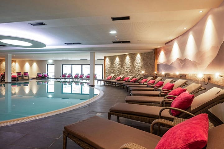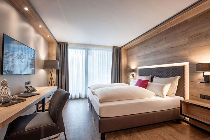 Das komfortable Hotel bietet neben den insgesamt 120 Wohneinheiten eine einladende Empfangshalle mit Sitzgelegenheit, eine Rezeption, einen Innenpool, eine E-Auto Ladestation und einen hochmodernen Sportshop direkt im Haus